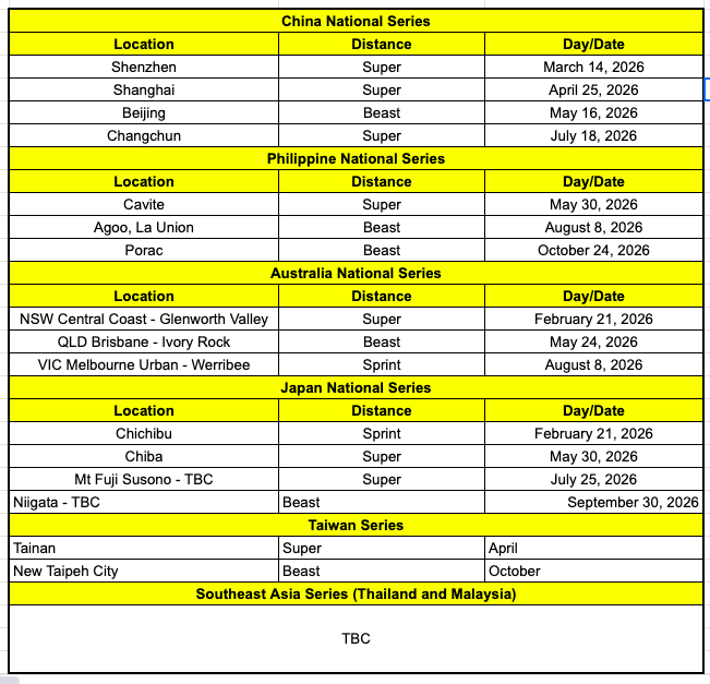 • One World Championship event per distance, includes Championships for 100M, Sprint, Super, Beast, Ultra, Trifecta, World’s Toughest Mudder and DEKA